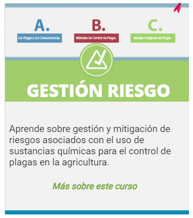 ¿Qué es riesgo y peligro?, ¿cuáles son las herramientas que autoridades y agricultores tienen para reducir el riesgo al utilizar plaguicidas?, estos son algunos interrogantes que se responden en los tres módulos del curso Gestión y Mitigación de Riesgo de Plaguicidas, disponible en español y próximamente en portugués e inglés.