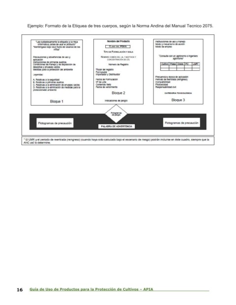 Ejemplo: Formato de la Etiquea de tres cuerpos, según la Norma Andina del Manual Tecnico 2075. 16 Guía de Uso de Productos para la Protección de Cultivos – APIA