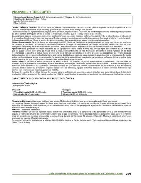 de acuerdo al uso zonal. La formulación combinada (Propanil + Triclopyr) es calificada con un riesgo “Moderado” debido a su uso en post-
