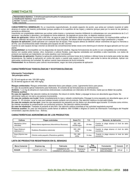 Compatibilidad: es incompatible con los plaguicidas de reacción alcalina. Algunas formulaciones de azufre no son compatibles con el dimetoato.