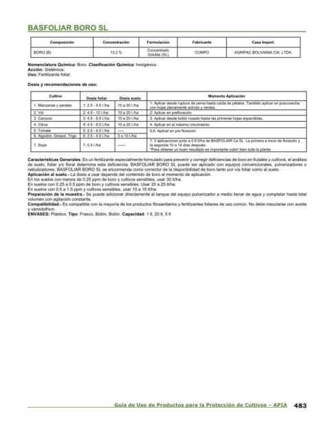 En suelos con 0.25 a 0.5 ppm de boro y cultivos sensibles. Usar 20 a 25 lt/ha.