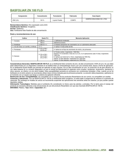 Carencias y tolerancias.- Por ser BASFOLIAR Zn 100 flo un fertilizante foliar inorgánico, no está sujeto a exigencias de residuos ni a periodos de