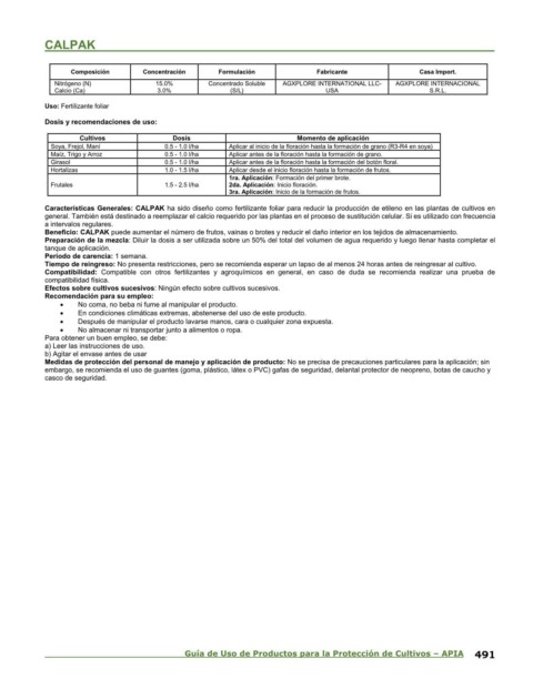 Características Generales: CALPAK ha sido diseño como fertilizante foliar para reducir la producción de etileno en las plantas de cultivos en