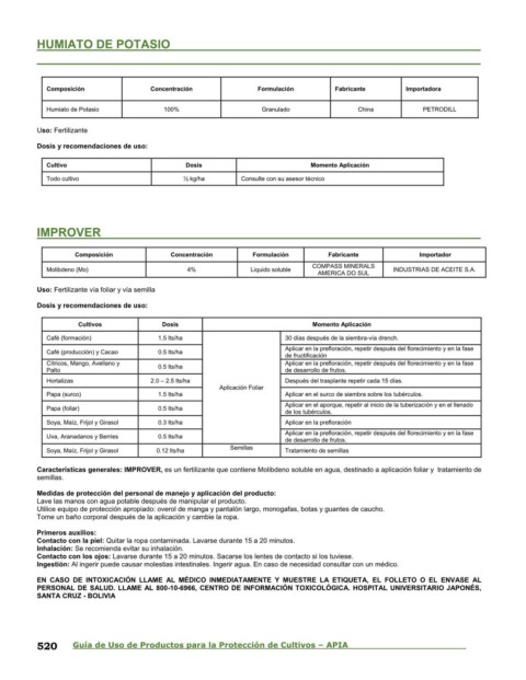 Características generales: IMPROVER, es un fertilizante que contiene Molibdeno soluble en agua, destinado a aplicación foliar y tratamiento de