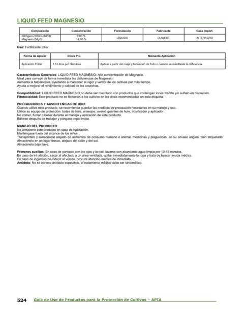 Compatibilidad: LIQUID FEED MAGNESIO no debe ser mezclado con productos que contengan iones fosfato y/o sulfato en disolución.