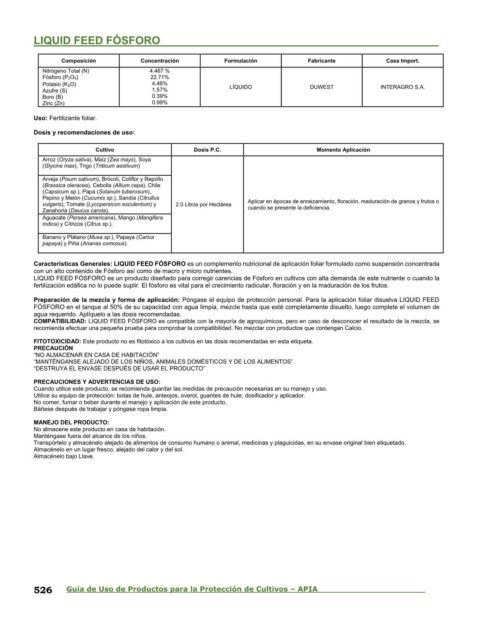 Características Generales: LIQUID FEED FÓSFORO es un complemento nutricional de aplicación foliar formulado como suspensión concentrada
