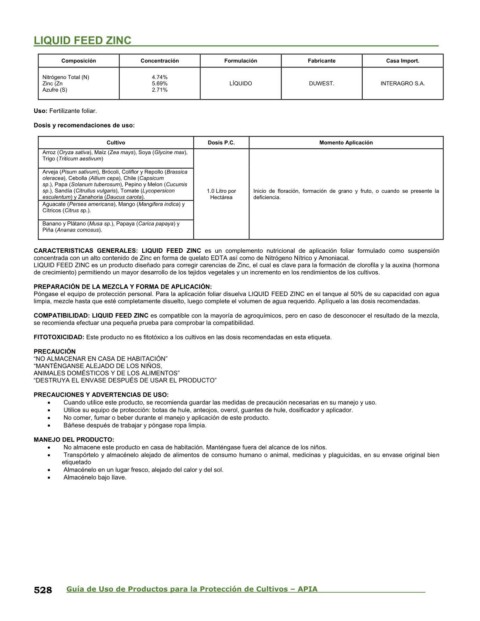 CARACTERISTICAS GENERALES: LIQUID FEED ZINC es un complemento nutricional de aplicación foliar formulado como suspensión