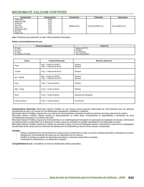 Características Generales: Micromate Calcium Fortified, es una mezcla química granular balanceada de micronutrientes para ser aplicada