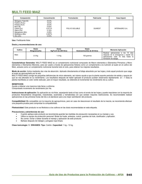Características Generales: MULTI FEED MAIZ es un complemento nutricional compuesto de Macro elementos o Elementos Primarios y Micro