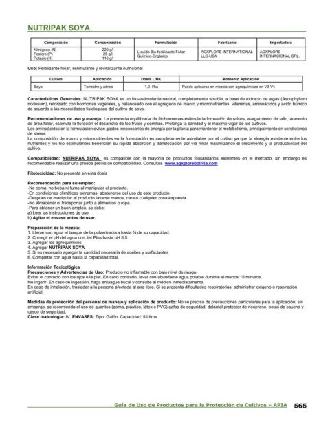Compatibilidad: NUTRIPAK SOYA es compatible con la mayoría de productos fitosanitarios existentes en el mercado, sin embargo es