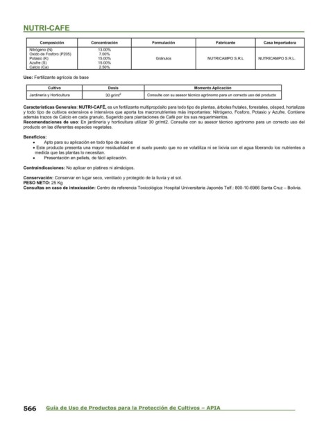 Características Generales: NUTRI-CAFÉ, es un fertilizante multipropósito para todo tipo de plantas, árboles frutales, forestales, césped, hortalizas