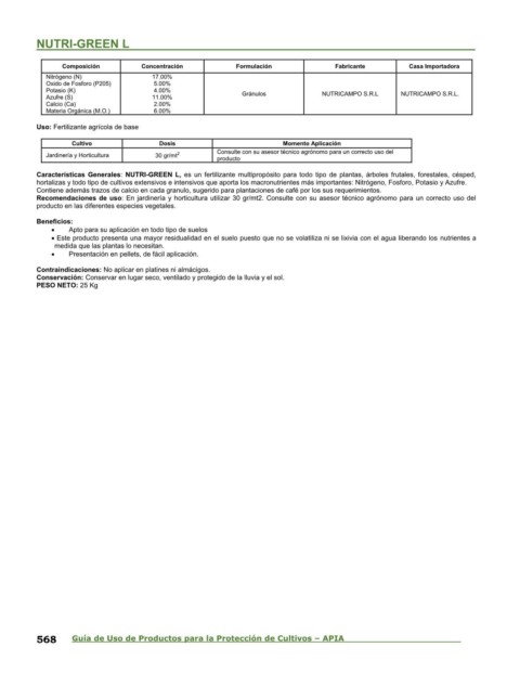 Características Generales: NUTRI-GREEN L, es un fertilizante multipropósito para todo tipo de plantas, árboles frutales, forestales, césped,