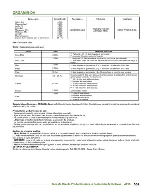 Características Generales: ORGAMIN-DA es un fertilizante líquido de aplicación foliar. Diseñado para cumplir la función de suplemento nutricional