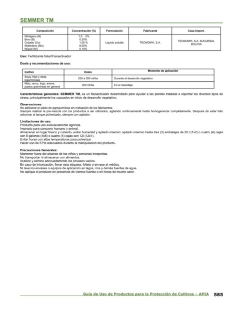 Características generales: SEMMER TM, es un fisioactivador desarrollado para ayudar a las plantas tratadas a soportar los diversos tipos de