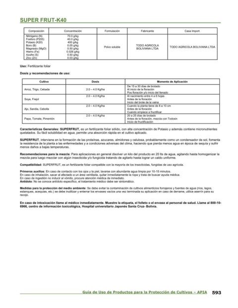 Compatibilidad: SUPERFRUT, es un fertilizante foliar compatible con la mayoría de los insecticidas, fungidas de uso agrícola.