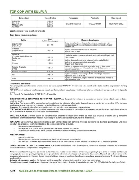 CARACTERISTICAS GENERALES: TOP COP WITH SULFUR, es Nutriprotector, único en el Mercado con azufre y cobre tribásico con un doble