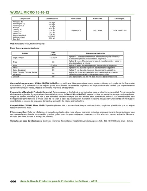 Compatibilidad: WUXAL Micro 16-16-12 puede aplicarse sólo o en mezcla de tanque con insecticidas, fungicidas y herbicidas que no tengan